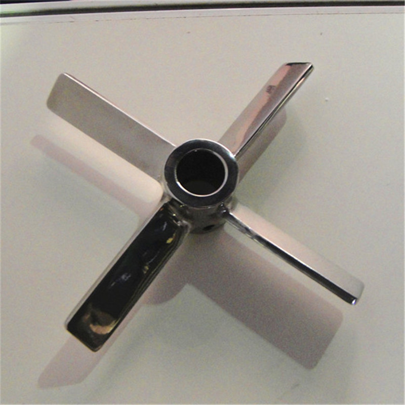 推進(jìn)式攪拌器(四葉旋槳式攪拌器)推進(jìn)式攪拌器容積循環(huán)速率大,在工作時(shí)能很好的使流體在隨槳葉旋轉(zhuǎn)的同時(shí)進(jìn)行上下翻騰,即容易使低粘度流體流動(dòng)處于湍流狀態(tài)。但由于在旋轉(zhuǎn)時(shí),主要對(duì)流體作用軸向的推力,對(duì)流體所作用的剪力很小,這種攪拌器難以使高粘度流體處于湍流狀態(tài),也難以使高粘度流體充分?jǐn)嚢杌旌?。推進(jìn)式攪拌器的轉(zhuǎn)速一般應(yīng)在60-200r/min范圍內(nèi),故這種攪拌器一般適用于低粘度流體的混合操作。